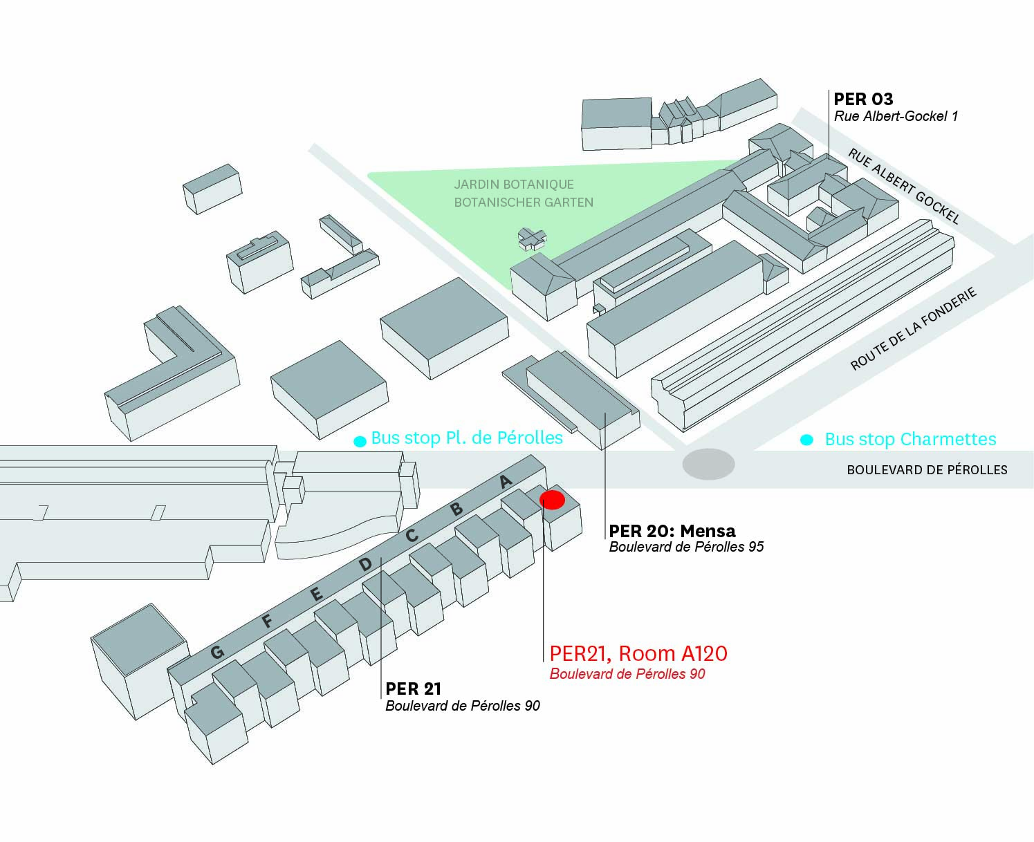 - Bei der Ankunft am Morgen: Raum A120, Gebäude PER21, Boulevard de Pérolles 90 (folgen Sie der Beschilderung).