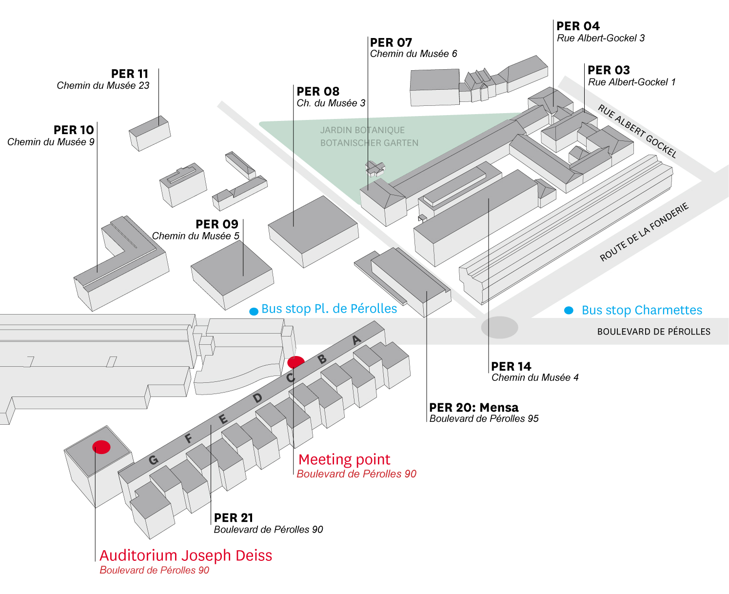 - A l'arrivée le matin: Auditoire Joseph Deiss, bâtment PER22, Boulevard de Pérolles 90 (suivez les panneaux fléchés).